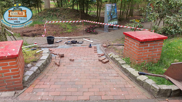 In der letzten Woche eröffneten wir die neue Ritter Murmelei. Ein paar Restarbeiten werden gerade noch erledigt. An einigen Stellen wird Pflaster ausgebessert. Eine baufällige und inzwischen nutzlose Brücke aus dem ehemaligen Zwergenland wurde entfernt und an der stelle der Weg durchgepflastert.